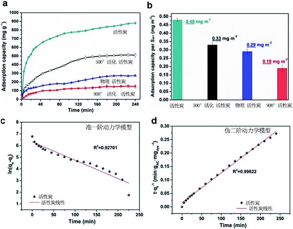 圖2、吸附動力學結(jié)果。(a)吸附能力隨時間的變化;(b)典型樣品的BET表面積的標準化吸附容量;(c)活性炭的偽一階動力學擬合;(d)活性炭的偽二階動力學擬合。