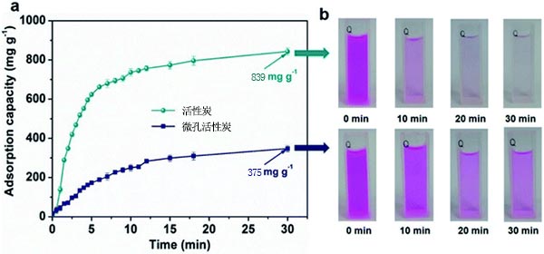 由于縮短吸附時間對于經(jīng)濟有效的工業(yè)操作具有重要意義,我們進一步采用超聲輔助策略來加速RhB吸附并縮短制備的活性炭的飽和時間,這對制備的活性炭的孔結(jié)構(gòu)幾乎沒有影響。超聲輔助下的吸附時間固定為30分鐘。圖3a顯示了在30分活性炭和微孔活性炭作為時間函數(shù)的吸附容量,活性炭從中獲得高達839 mg/g-1的高RhB吸附容量。在30分鐘內(nèi)(飽和容量的99%),而微孔活性炭可以獲得67%的飽和吸附容量(345 mg/g-1)),進一步證明了分級多孔活性炭相對于微孔活性炭的吸附動力學優(yōu)勢。圖3b進一步說明了這兩種樣品隨時間的上清液的顏色變化,其生動地證明了活性炭相對于微孔活性炭的高速吸附能力。